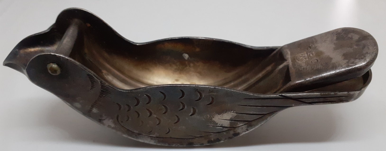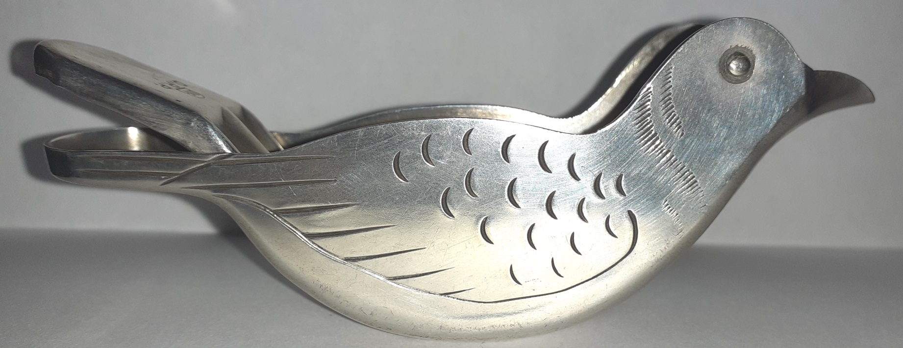 Versilberte Art Déco-Zitronenpresse in Vogelform, möglicherweise soll eine Taube dargestellt werden. Die Entstehungszeit dürfte in den 1920er bis 1930er Jahren liegen.