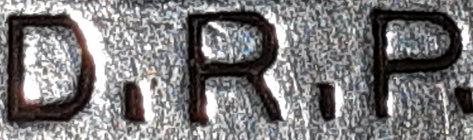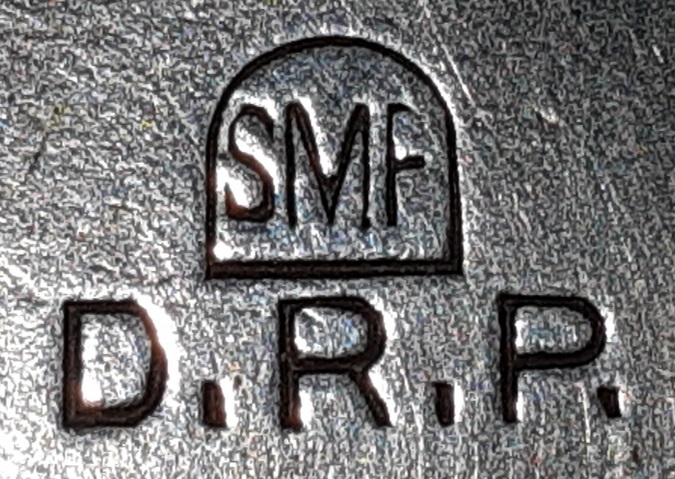 Die Zitronenpresse trägt auf der Daumenauflage das umrahmte Hersteller-Logo SMF (vgl. Abb. 2) sowie die Kennung D.R.P. (vgl. Abb. 3 und 4) - letztere steht für Deutsches Reichspatent. Für die Zitronenpresse gab es also ein angemeldetes Patent, wobei derlei Gegenstände nur bis 1945 mit D.R.P. gekennzeichnet wurden.